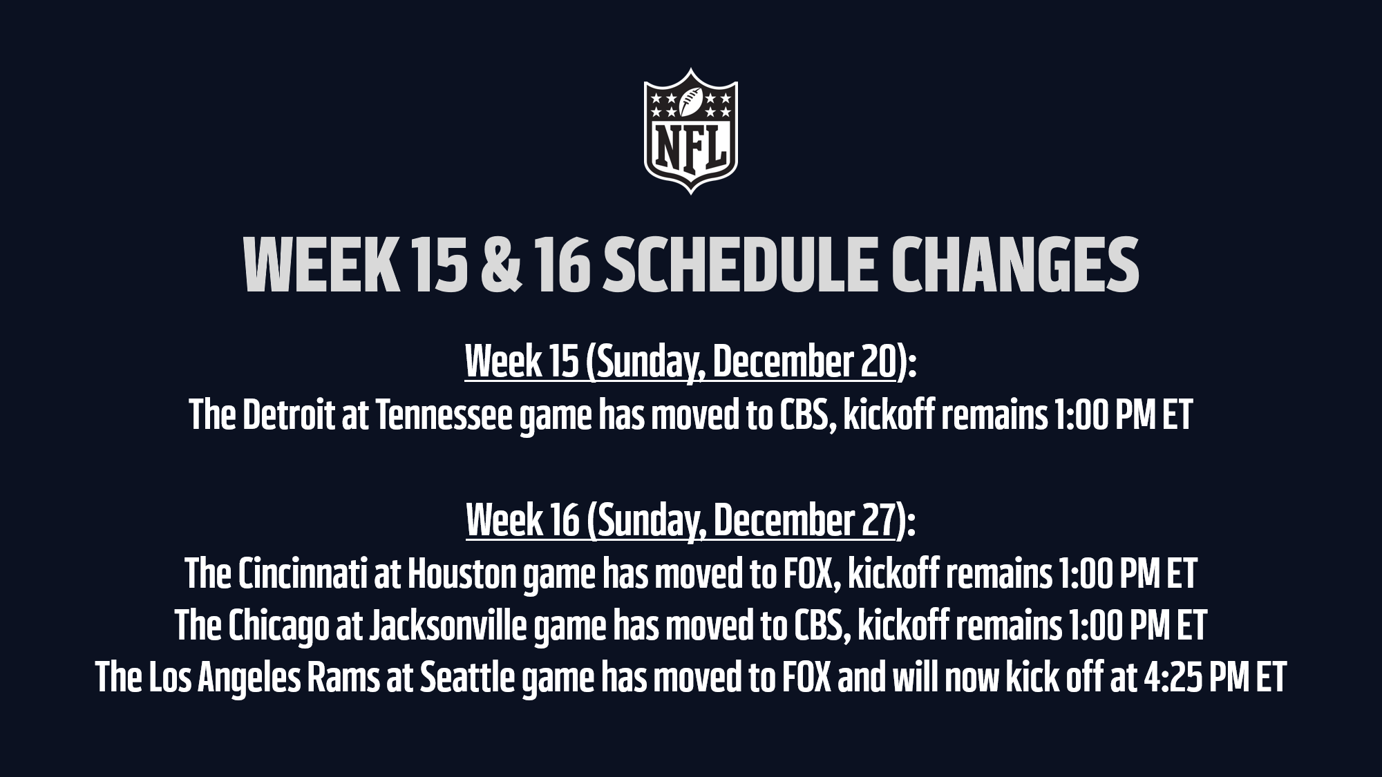 Football season is back in action. Nfl on pickingpros.com provides weekly schedules & game times including other team information for 2020. List of nfl weekly football games. Here is the full 2020 seahawks schedule In each of weeks 15 and 16, up to three of five designated matchups will be played on saturday with the remainder to be played on sunday. Los angeles chargers at las vegas raiders. Normally, saturday games would stand alone for the nfl, but in week 15 of 2020, there are college football conference championships to. All times are et and subject to change. Week 1 week 2 week 3 week 4 week 5 week 6 week 7 week 8 week 9 week 10 week 11 week 12 week 13 week 14 week 15 week 16 week 17 playoffs. Find out the latest on your favorite national football league teams on cbssports.com. Here is how the schedule will look this weekend as the league nears baltimore hasn't played in the conference title game since 2013. Kansas city chiefs at buffalo bills (due to schedule changes from positive coronavirus tests, this game time: Physical data is courtesy of nfl.com and playerprofiler.com, alignment information is from pro.
