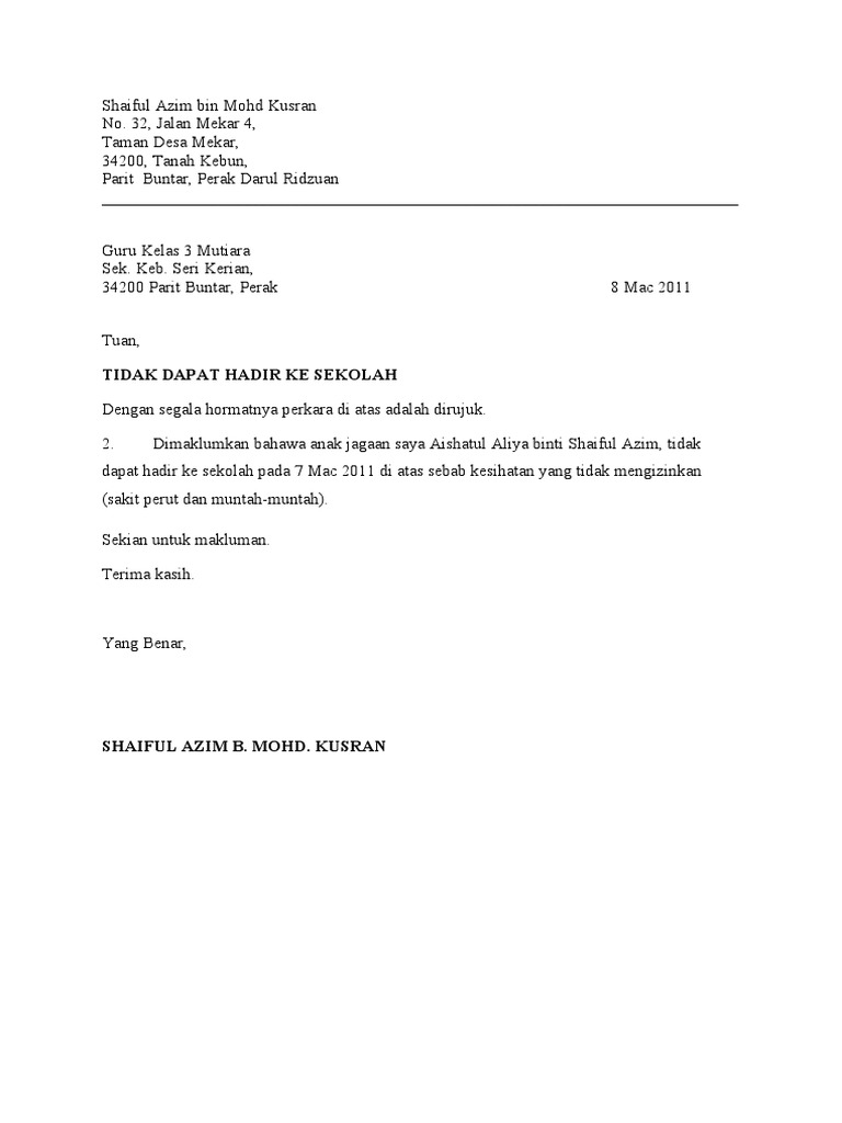 9 Contoh Surat Rasmi Tidak Hadir Ke Sekolah Kerana Sakit Contoh Surat Tidak Hadir Ke Sekolah Beserta Format Terkini 2020 Untuk Lebih Jelasnya Contoh Tentang Surat Izin from i1.wp.com Disini saya akan memberikan contoh surat bagaimana kita meminta izin cuti kepada perusahaan. Surat cuti sakit dibuat oleh seseorang yang biasanya memiliki penyakit yang cukup serius sehingga memerlukan waktu yang cukup lama untuk pem. Dalam prakteknya kadang surat permohonan cuti dalam bentuk kertas itu menyulitkan administrasi hrd. Pengajuan cuti semacam ini biasanya disertai dengan surat keterangan dari dokter atau rumah sakit apabila diperlukan. Cara membuatnya pun sama, yang contoh surat cuti tersebut bisa anda lihat sebagai berikut Untuk cuti sakit, perusahaan akan membayarkan gaji atau upah karyawan selama empat bulan pertama secara penuh dan 75% untuk empat bulan selanjutnya. Contoh surat rasmi tidak hadir ke sekolah sakit urusan. Jika hasil pemeriksaan dokter menganjurkan untuk perawatan intensif atau istirahat selama beberapa hari.